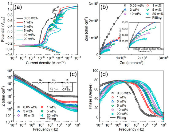 The Nyquist plots, Bode impedance plots, and Bode phase-angle plots of the Fe-based AMCs in KCl solutions with various concentration are shown in Figure 3b–d, respectively. The Nyquist plots of the Fe-based AMCs exhibit two capacitive rings, with the size of the capacitive rings decreasing as the KCl concentration increases. The equivalent circuit of the Fe-based AMCs, as depicted in Figure 3c, comprises solution resistance (Rs), the sum of the coating resistance and solution resistance in pores (Rc), capacitance of Fe-based AMCs (CPEc), charge-transfer resistance at the Fe-based AMCs–corrosion solution interface (Rt), and double-layer capacitance of the Fe-based AMCs–corrosion solution interface (CPEdl) [32]. The fitting parameters of the EIS data recorded in KCl solution with various concentrations are listed in Table 3. In general, the corrosion resistance of Fe-based AMCs can be evaluated by comparing the values of Rc and Rt, and the higher the resistance, the higher the corrosion resistance of the Fe-based AMCs. In 0.05 wt% KCl solution, the Rc and Rt of the Fe-based AMC were 337,440 Ω·cm2 and 999,910 Ω·cm2, respectively. However, as the KCl concentration increased to 20 wt.%, the Rc and Rt decreased to 38,112 Ω·cm2 and 31,655 Ω·cm2, respectively. This decrease in Rc and Rt illustrates the significant deterioration in the corrosion resistance of Fe-based AMCs under increasing KCl concentrations. Furthermore, the capacitance values of CPEc and CPEdl increase with the increase in KCl concentration, because of the damage caused by Cl− ions to the passive films and the increase in the true corrosion areas caused by solution infiltration and corrosion [33].