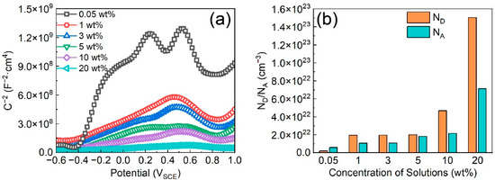 In a corrosion solution, passive films with semiconductor properties will be formed on Fe-based AMCs to prohibit the direct interaction between the coating and the corrosion solution, slow down the charge transfer, and improve the corrosion resistance [34]. The protective efficacy of passive films is contingent upon their carrier density. Specifically, passive films with low carrier density possess superior compactness and enhanced protective capabilities [35]. In KCl solutions with various concentrations, the Mott–Schottky curves of the passive films formed on Fe-based AMCs are illustrated in Figure 4a. Notably, the Mott–Schottky curves highlight two distinct linear regions: one with a positive slope from −0.4 VSCE to 0.2 VSCE, and another one with a negative slope from 0.5 VSCE to 0.8 VSCE. Therefore, bipolar passive films can be formed on Fe-based AMCs, regardless of KCl concentration. That is, the passive films exhibit the combined characteristics of both p-type and n-type semiconductors. The donor (ND) or acceptor (NA) concentration of the passive films can be calculated from the space-charge capacitance CSC, and the formula is as follows [36]: