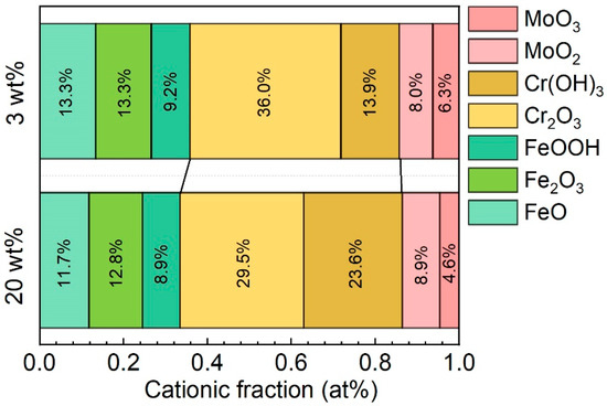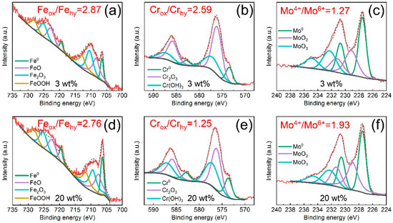 To further investigate the influence of Cl− ions on the passive films, the surface chemical compositions of Fe-based AMCs immersed in 3 wt% or 20 wt% KCl solution for 30 d were examined. The XPS spectra of the passive films that formed on the Fe-based AMCs are depicted in Figure 5. Whether in 3 wt% KCl solution or 20 wt% KCl solution, the XPS spectra of Fe 2p contain four groups of bimodal peaks, namely, Fe0, FeO, Fe2O3, and FeOOH; the XPS spectra of Cr 2p consist of three groups of bimodal peaks, including Cr0, Cr2O3, and Cr(OH)3. Additionally, the XPS spectra of Mo 3d comprise three groups of bimodal peaks, which are Mo0, MoO2, and MoO3. Consequently, with the increase in the KCl concentration, the constituent phases of the passive films formed on the Fe-based AMCs remain unaltered, but the relative contents of the constituent phases are changed significantly. Based on the XPS analysis, the Feox/Fehy ratio of the passive film formed in 3 wt% KCl solution was 2.87, while it decreased to 2.76 when the KCl concentration increased to 20 wt%. As the KCl concentration increased from 3 wt% to 20 wt%, the Crox/Crhy ratio in the passive films decreased from 2.59 to 1.25, while the Mo4+/Mo6+ ratio increased from 1.27 to 1.93.