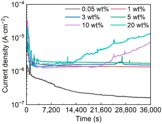 The potentiostatic polarization curves of Fe-based AMCs at 0.3 VSCE in KCl solutions with various concentrations are shown in Figure 7. In the initial stage of potentiostatic polarization, the polarization current densities of Fe-based AMCs exhibit a remarkable decline owing to the formation of passive films on the Fe-based AMCs. As the passive films become more stable, the decreasing trends of polarization current densities gradually ease or remain unchanged. In 0.05 wt% KCl solution, the polarization current densities of the Fe-based AMCs continue to decrease, indicating the improvement in the compactness of the passive films. When the KCl concentration is 1 wt%, 3 wt%, or 5 wt%, the polarization current densities of Fe-based AMCs remain stable, with little fluctuation. However, in 10 wt% KCl solution, the polarization current density fluctuates violently at a certain value and significantly increases after polarization for 21,200 s. As the KCl concentration increases to 20 wt%, the fluctuation in the polarization current density increases, and the polarization current density increases as the polarization time exceeds 13,500 s. Moreover, it should be noted that the polarization current densities of Fe-based AMCs increase with the increase in the KCl concentration. In a corrosive environment, the passive films formed on Fe-based AMCs play a crucial role in suppressing corrosion. Under low concentrations of Cl− ions, compact passive films can be gradually formed on Fe-based AMCs, and the polarization current densities of Fe-based AMCs decrease with the increase in the compactness of the passive film. However, when the concentration of Cl− ions is high, the compactness of the passive films decreases and metastable pitting occurs on the Fe-based AMCs, resulting in significant fluctuations in the polarization current densities. Over time, stable pitting corrosion takes place on the Fe-based AMCs, leading to a continuous increase in the polarization current densities. Therefore, similar to stainless steels or aluminum alloys, the presence of Cl− ions has a destructive effect on the passive films formed on Fe-based AMCs, and an increase in the concentration of Cl− ions will exacerbate the corrosion rates of Fe-based AMCs and diminish their pitting resistance [34,40].