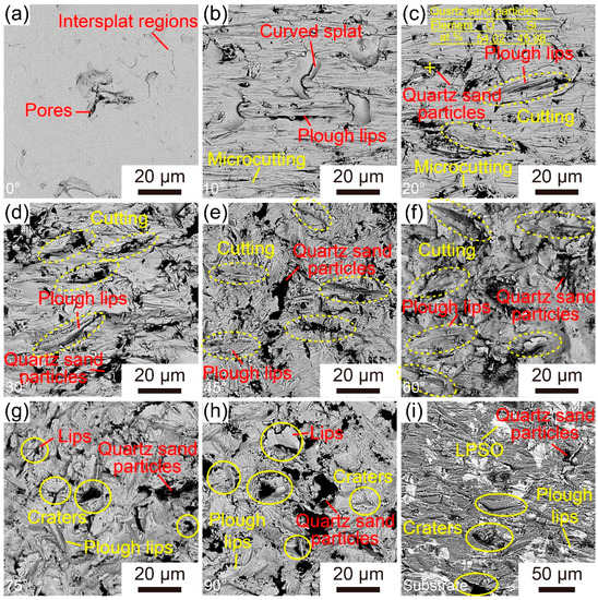 Figure 10a–h illustrate the surface morphologies of the Fe-based AMCs eroded at different impact angles. The surface of uneroded Fe-based AMCs is very smooth, with only some inter-splat regions and inherent pores visible. When the impact angle is 10°, the surface of the Fe-based AMC becomes rough, and many small grooves with the same direction and some fresh splats exposed by the exfoliation of amorphous splats can be observed. As the impact angle increases to 20°, in addition to those small grooves, large grooves and plough lips emerge on the coating surfaces. It is worth noting that some broken quartz sand particles are embedded in the coating surfaces, indicating the high hardness of Fe-based AMCs. With the further increase in the impact angle, the number of large grooves continues to increase, while the number of small grooves gradually decreases. At an impact angle of 75°, in addition to large grooves and plough lips, craters and their corresponding lips appear on the coating surfaces. Notably, some broken quartz sand particles can be clearly observed in the craters. When the impact angle reaches 90°, the number of craters significantly increases, accompanied by more conspicuous deformation of amorphous splats.