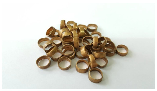 In the experiments, Cu–Zn alloy scrap was used (see Table 1 for its chemical composition). The research material consisted of rings that are waste elements of pipe production (Figure 1). In each of the measurements, the weight of the sample was about 1 g, and the particle size was in the range of 4 ÷ 6 mm.