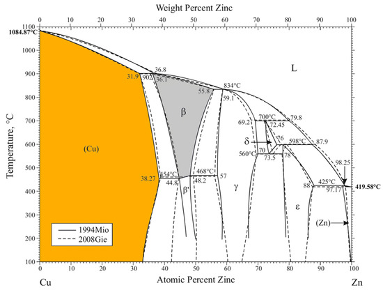 - Plewa, J.; Blacha, L.; Wojtala, J. Własności Termodynamiczne Ciekłych Roztworów Zn-Cu. Rudy Metale 1984, 29, 234–239. [Google Scholar]
