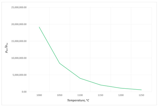 The thermodynamic data from HSC Chemistry 10.3.4 were applied to determine the vapour pressures of copper and zinc over the pure liquid [4]. The changes in the vapour pressures of zinc and copper over the alloys containing up to 11 wt% Zn within 1080 ÷ 1240 °C are presented in Figure 4 and Figure 5, respectively. The data show that the estimated values pCu and pZn are markedly different; at 1080 °C, pCu is 0.02 Pa and pZn is 39,529 Pa, while at 1240 °C, they are 0.14 Pa and 83,000 Pa, respectively. The pZn/pCu ratio values for the studied alloy (10.53 wt% Zn) within the analysed temperature range are above 5 × 105 °C(Figure 6). Thus, it may be assumed that practically only zinc is present in the gas phase over the liquid Cu–Zn alloy in the temperature conditions of the experiments.