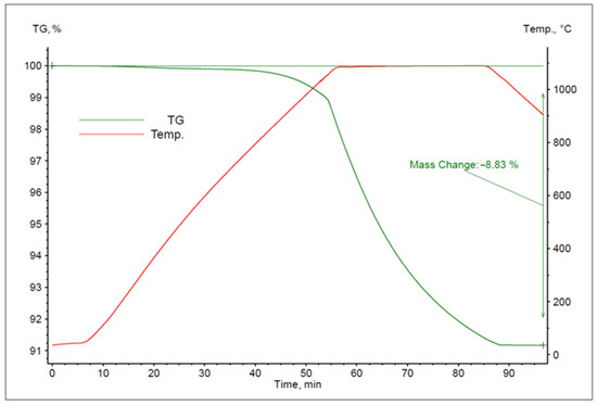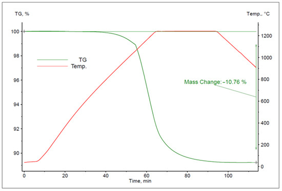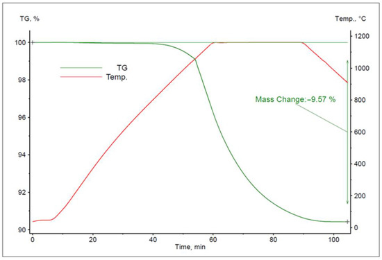 The study conducted based on the above research plan yielded a series of thermogravimetric (TG) curves. To analyse the results, examples of TG curves for the experiments performed at 1080, 1160 and 1240 °C are presented in Figure 7, Figure 8 and Figure 9.