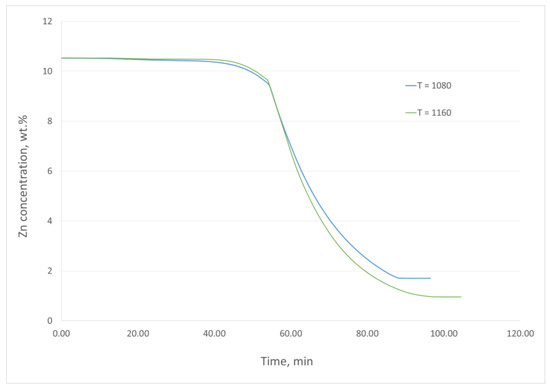 In addition, the changes in the zinc concentration in the alloy during the experiments were estimated based on the results of the thermogravimetric measurements. The mass losses of the remaining elements will not have a significant impact on the calculations of the metal removal rate in this case. The exemplary changes in the zinc content in the alloy during the experiments performed at 1080 °C and 1160 °C are presented in Figure 10.
