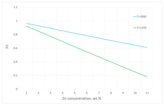 Figure 11 illustrates the values ∆π = f(CZn) for the analysed evaporation process, determined based on Equation (8). It can be clearly seen that when the content of zinc in the alloy decreases, the value of the driving force also becomes reduced, which explains the fact that the temperature rise resulted in smaller mass losses of the samples within the isothermal range of the measurements.