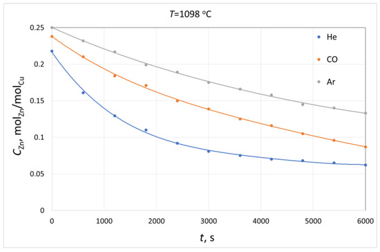 In paper [51], the results of the research on the rate of zinc evaporation from Cu–Zn alloys in the atmospheres of argon, carbon monoxide and helium are presented. Examples of changes in the zinc concentration in the alloy containing copper during the remelting process (obtained by the authors) are shown in Figure 13.