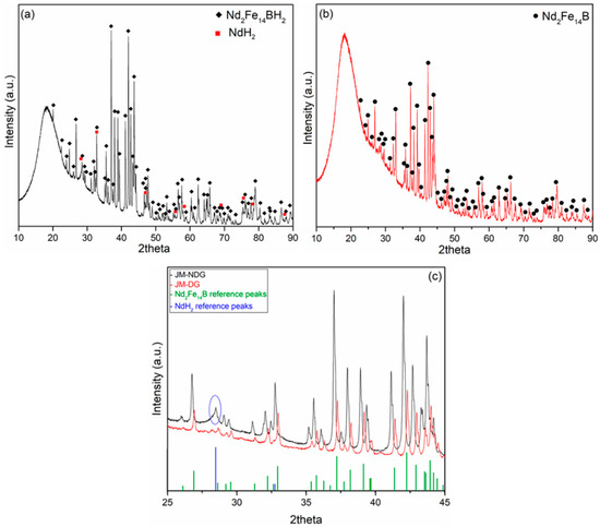 XRD pattern of the (a) jet-milled not degassed (JM-NDG), (b) jet-milled and degassed (JM-DG) Nd-Fe-B powder, (c) focused area comparison (25 ≤ 2θ ≤ 45) of the two patterns against each other and the reference peaks of the Nd2Fe14B (ICDD Card No: 00-039-0473, Tetragonal) and NdH2 (ICDD Card No: 96-153-8931, Cubic).