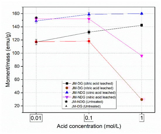 The effect of leaching with nitric and citric acids on the magnetic properties of the JM-NDG and JM-DG powders was studied. Figure 3 shows the dependence of the magnetic moment per unit mass (hereafter mentioned as moment/mass) on the acid concentration. Note that the initial moment/mass of the untreated JM-NDG (153.8 emu/g) is higher than the untreated JM-DG (117.3 emu/g). This is attributed to hydrogen, which is interstitially absorbed in the Nd2F14B phase. The unit cell consequently expands, inhibiting the Fe atoms’ antiferromagnetic coupling, thus enhancing the magnetization of the hydrogenated powder (JM-NDG) [27].