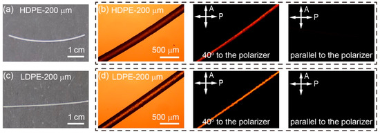 Photographs and PLM images of HDPE and LDPE fibers. (a) Photograph of an FDM-printed 200 μm HDPE fiber. (b) PLM images of an HDPE fiber parallel to the polarizer or at a 40° angle with respect to the polarizer. (c) Photograph of an FDM-printed 200 μm LDPE fiber. (d) PLM images of an LDPE fiber parallel to the polarizer or at a 40° angle with respect to the polarizer.