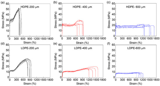 Mechanical performance of HDPE and LDPE fibers with different diameters. Stress–strain curves of HDPE fibers with diameters of (a) 200 μm, (b) 400 μm and (c) 600 μm and LDPE fibers with diameters of (d) 200 μm, (e) 400 μm and (f) 600 μm. The printer head temperature was 215 °C. HDPE and LDPE fibers with a diameter of 200 μm, 400 μm and 600 μm were prepared with collecting speeds of 11.6 cm/s, 3.1 cm/s and 1.2 cm/s, respectively. Five samples were tested for each system, corresponding to five stress–strain curves.