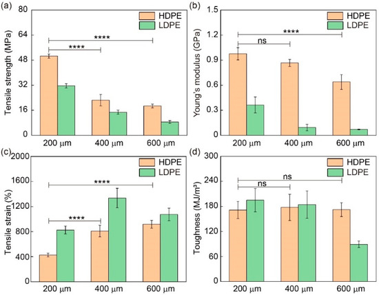 Mechanical properties of HDPE and LDPE fibers with different diameters. (a) Tensile strength, (b) Young’s modulus (1% strain), (c) tensile strain and (d) toughness of HDPE and LDPE fibers with diameters of 200 μm, 400 μm and 600 μm. The printer head temperature was 215 °C. HDPE and LDPE fibers with diameters of 200 μm, 400 μm and 600 μm were prepared with collecting speeds of 11.6 cm/s, 3.1 cm/s and 1.2 cm/s, respectively. Unless otherwise specified, Young’s modulus was determined at 1% strain. Unless otherwise specified, statistical significance was analyzed only between the groups of HDPE fibers for clarity. Unless otherwise specified, ns denotes not significant; **** denotes p < 0.0001. p is the probability that the difference between the two sets of data is caused by experimental error.