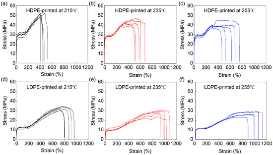 Mechanical performance of HDPE and LDPE fibers printed at different printer head temperatures. Stress–strain curves of HDPE fibers printed at (a) 215 °C, (b) 235 °C and (c) 255 °C and LDPE fibers printed at (d) 215 °C, (e) 235 °C and (f) 255 °C. The diameter of HDPE and LDPE fibers was about 200 μm.