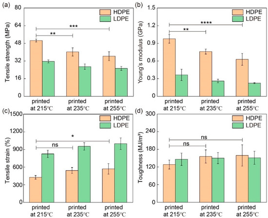 Mechanical properties of HDPE and LDPE fibers printed at different printer head temperatures. (a) Tensile strength, (b) Young’s modulus (1% strain), (c) tensile strain and (d) toughness of HDPE and LDPE fibers printed at 215 °C, 235 °C and 255 °C. The diameter of HDPE and LDPE fibers was about 200 μm. ns denotes not significant; * denotes p < 0.05; ** denotes p < 0.01; *** denotes p < 0.001; **** denotes p < 0.0001. p is the probability that the difference between the two sets of data is caused by experimental error.