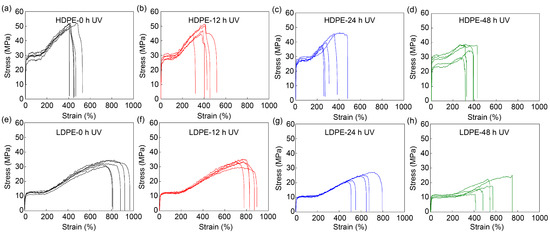 Mechanical performance of HDPE fibers before and after UV exposure. Stress–strain curves of HDPE fibers (a) before UV exposure, (b) after 12 h, (c) after 24 h and (d) after 48 h UV exposure, and of LDPE fibers (e) before UV exposure, (f) after 12 h, (g) after 24 h and (h) after 48 h UV exposure. The printer head temperature was 215 °C. The diameter of HDPE and LDPE fibers was about 200 μm. The samples were placed 8 cm under a UV lamp (395 nm, 18 W).