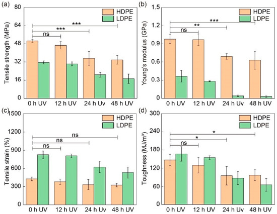 Mechanical properties of HDPE and LDPE fibers before and after UV exposure. (a) Tensile strength, (b) Young’s modulus, (c) tensile strain and (d) toughness of HDPE and LDPE fibers before UV exposure and after 12 h, 24 h and 48 h UV exposure. The printer head temperature was 215 °C. The diameter of HDPE and LDPE fibers was about 200 μm. The samples were placed 8 cm under a UV lamp (395 nm, 18 W). ns denotes not significant; * denotes p < 0.05; ** denotes p < 0.01; *** denotes p < 0.001. p is the probability that the difference between the two sets of data is caused by experimental error.