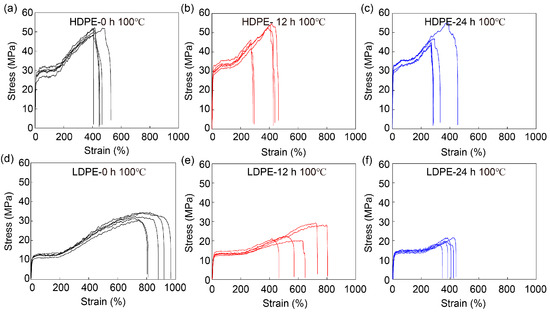 Mechanical performance of HDPE and LDPE fibers before and after thermal degradation. Stress–strain curves of HDPE fibers (a) before baking, (b) after 12 h and (c) after 24 h baking at 100 °C, and of LDPE fibers (d) before baking, (e) after 12 h and (f) after 24 h baking at 100 °C. The printer head temperature was 215 °C. The diameter of HDPE and LDPE fibers was about 200 μm.