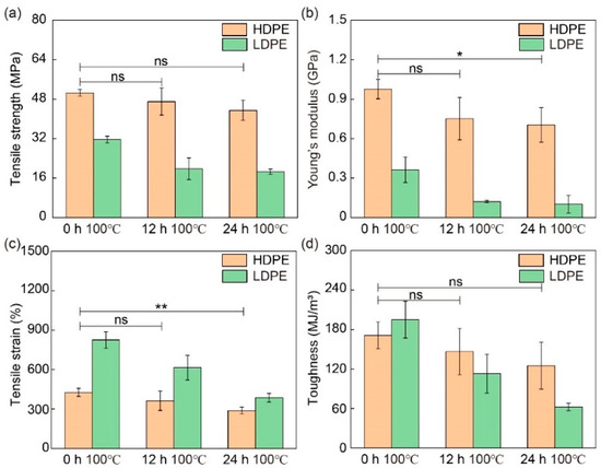 Mechanical properties of HDPE and LDPE fibers before and after thermal degradation. (a) Tensile strength, (b) Young’s modulus, (c) tensile strain and (d) toughness of HDPE and LDPE fibers before baking and after 12 h and 24 h baking at 100 °C. The printer head temperature was 215 °C. The diameter of HDPE and LDPE fibers was about 200 µm. ns denotes not significant; * denotes p < 0.05; ** denotes p < 0.01. p is the probability that the difference between the two sets of data is caused by experimental error.