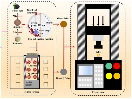 (1) Pellet Manufacturing: 200 g of experimental material, limonite powder, is weighed. Binders in different proportions (0.4 wt.%, 0.8 wt.%, 1.2 wt.%, 1.6 wt.%, and 2.0 wt.%) are added, and the materials are thoroughly mixed using the multiple folding and stirring method. The balling machine is started, and approximately 2/3 of the mixed material is added to the machine. Water is slowly dripped onto the surface of the mixture to form pellets with a diameter of approximately 3 mm over a period of 3 min. Every 3 min, a mist of water is sprayed onto the surface of the mother pellets, and material is added to the wetted surface to allow the pellets to continuously roll and grow. The process is generally controlled within 12 min to achieve pellets of the desired size (9–16 mm). After stopping the addition of water and material, the pellets are allowed to continue rotating in the balling machine for approximately 2 min to achieve compaction. The pellets are removed using a small scoop. The pellets are separated using a vernier caliper, and the pellets with a diameter of 9–16 mm are considered qualified products, while the remaining pellets are deemed unqualified.