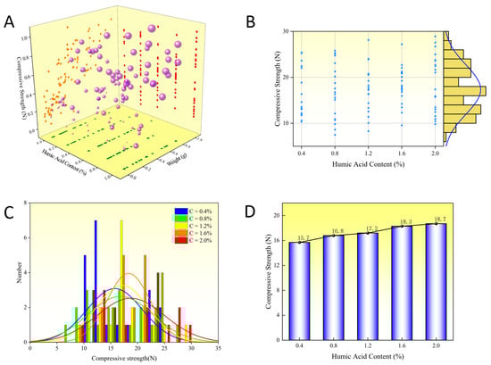 Effect of humic acid on compressive strength of limonite green pellets. (A) Stereo scatter data. (B) Planar scatter data. (C) Normal distribution of data. (D) The average of the scatter data.