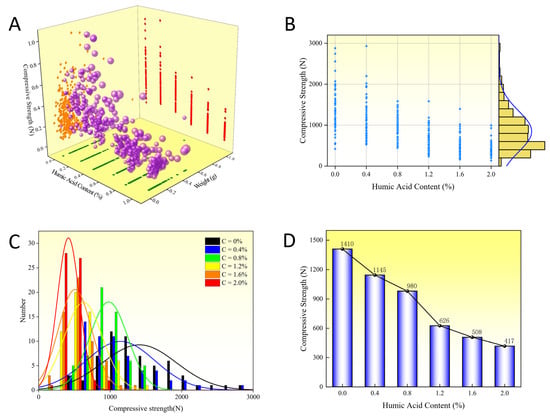 As shown in Figure 5A, the influence of humic acid content, roasted pellet weight, and diameter on the compressive strength of roasted limonite pellets is depicted. The size of the pellets is represented by the size of purple spheres, and the data for the four parameters have been normalized. The compressive strength of the pellets increases with increasing weight, with larger pellets mainly distributed towards the upper end and smaller pellets towards the lower end. With the increase in humic acid content, the compressive strength of the roasted pellets decreases. Figure 5B,C presents scatter plots and normal distribution plots illustrating the effect of different proportions of humic acid on the compressive strength of the roasted pellets. The humic acid content has a significant impact on the compressive strength of the roasted pellets, showing a negative correlation. The effect of different proportions of humic acid on the compressive strength of the roasted pellets is illustrated in Figure 5D; when the proportion of humic acid in the pellet ore increases from 0.4% to 2.0%, the average compressive strength of the roasted pellets decreases, reaching a minimum value of 417 N at a humic acid content of 2.0%.