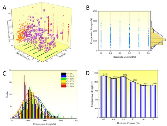 As shown in Figure 6A, the influence of bentonite content, roasting pellet weight, and diameter on the compressive strength of roasted limonite pellets is depicted. The size of the pellets is represented by the diameter of purple spheres, and the data for these four parameters have been normalized. The compressive strength of the roasted pellets increases with an increase in weight, with larger pellets predominantly distributed in the upper range and smaller pellets in the lower range. On the other hand, as the bentonite content increases, there is a downward trend observed in the compressive strength of the roasted pellets. Figure 6B,C illustrates the scatter plot and normal distribution plot, respectively, demonstrating the impact of different proportions of bentonite on the compressive strength of roasted pellets. The bentonite content indeed has an effect on the compressive strength of the roasted pellets, showing an overall negative correlation. Figure 6D presents the effects of different proportions of bentonite on the compressive strength of roasted pellets. It can be observed that as the bentonite content in the pellet ore increases from 0.4% to 2.0%, there is an overall decreasing trend in the average compressive strength of the roasted pellets. The minimum value of compressive strength is reached at a bentonite content of 1.6%, measuring 1085 N.