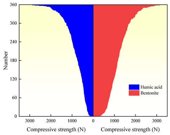 As shown in Figure 3A, the influence of humic acid content, pellet weight, and diameter on the compressive strength of limonite pellets is illustrated. The diameter of the pellets is represented by the size of the purple spheres, and the data for the four parameters have been normalized. The compressive strength of the pellets increases with the weight, and larger pellets are predominantly located at the top, while smaller pellets are mainly located at the bottom. The variation in compressive strength with increasing humic acid content is not significant and is primarily related to the diameter and weight. Figure 3B,C present the scatter plot and normal distribution plot illustrating the effect of different proportions of humic acid on the compressive strength of the pellets. The humic acid content has a positive correlation with the compressive strength of the pellets. The impact of different proportions of humic acid on the compressive strength of the pellets is depicted in Figure 3D; as the proportion of humic acid in the pellet increases from 0.4% to 2.0%, the average compressive strength of the pellets rises and reaches its maximum value of 18.7 N when the humic acid content reaches 2.0%.