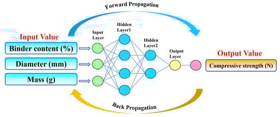 Bentonite, as the main binder for pellets, cannot undergo thermal decomposition during the smelting process and mostly remains in the pellets, leading to a decrease in the iron grade of the pelletized ore [15]. Qiu et al. [16] utilized organic binders to prepare pelletized ore and found that, compared to pellets prepared using bentonite, the resulting pellets had a higher iron grade and lower impurity content [17]. Humic acid, as an organic binder and a biomass-derived substance, exhibits strong adsorption capacity on the surface of iron ore, thereby enhancing the strength of green pellets [18,19]. Currently, there is limited research on the preparation of limonite pellets using humic acid as a binder, necessitating further investigation into humic acid-based limonite pellets. However, most studies on pellet compressive strength have relied on single-factor analysis or orthogonal experiments to qualitatively describe the influencing factors of various parameters, without considering the interactions among them [20]. Due to the limited number of experiments, the predictability is relatively poor [21]. Artificial neural networks (ANNs) offer a promising solution for predicting material properties and have been widely used in this context [22]. ANNs are often referred to as “black-box” models because they can make accurate predictions based on training data without providing any physical explanation behind the phenomena [23,24].