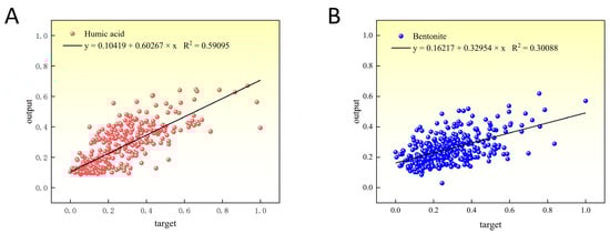 Scatter plot of target and output values. (A) Humic acid. (B) Bentonite.
