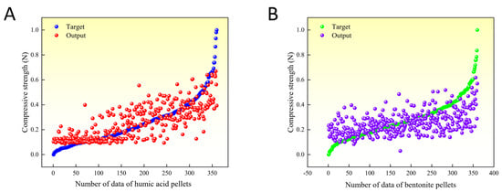 As shown in Figure 9, a scatter plot illustrates the correlation between the target values (experimental results) and the predicted values for the compressive strength of two types of indurated pellets, namely, humic acid-based and bentonite-based pellets. Linear regression analysis was performed on the data, yielding the linear regression equations and R-squared values, which were found to be 0.59095 and 0.30088 for humic acid-based and bentonite-based pellets, respectively.