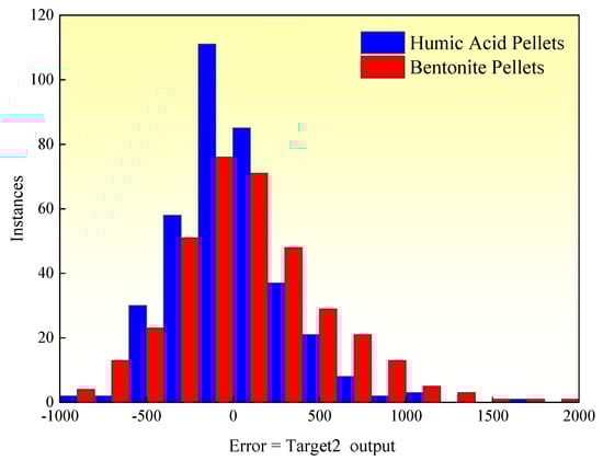 Furthermore, Figure 11 displays the absolute errors (target value − output value) between the target values (experimental results) and predicted values for the compressive strength of the indurated pellets. The errors follow a normal distribution pattern centered around zero. These findings demonstrate that the artificial neural network model designed in this study provides highly accurate predictions for the compressive strength of humic acid-based indurated limonite pellets. Importantly, the model successfully establishes the relationship between input variables (binder content, pellet diameter, and pellet weight) and the output variable (compressive strength).