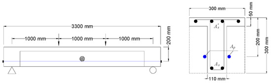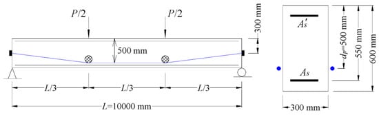 Two beam specimens (B4 and B5) are selected herein [17]. The T-beams had a clear span of 3000 mm, subjected to two concentrated loads at third points, as illustrated in Figure 1. External tendons were attached with one deviator at the midspan. The specimens were designed to be identical except for the prestress level, i.e., the initial prestress was 396 MPa for B4 and 889 MPa for B5. CFRP tendons had an area of 100.5 mm2, an elastic modulus of 158 GPa and a rupture strength of 2790 MPa. The bottom steel bars had an area of 402 mm2, an elastic modulus of 172 GPa and a yield strength of 560 MPa. The top steel bars had an area of 201 mm2, an elastic modulus of 187 GPa and a yield strength of 510 MPa. The targeted fck was 30 MPa.