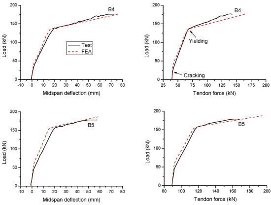 A comparison between the test and FEA results regarding the load versus deflection and load versus tendon force for two specimens is illustrated in Figure 2. It is seen that the FEA is able to reasonably capture the key response characteristics of the specimens during the complete loading stages, including the cracking, yielding and ultimate limit states. In addition, both test and FEA results demonstrate that Specimen B5 exhibits higher cracking and ultimate loads but a lower ultimate deflection and an increase in the tendon force compared to Specimen B4. This observation indicates the importance of the prestress level. In the following section, this variable is analyzed in more detail along with other important variables related to CFRP tendons (tendon area, depth and elastic modulus)