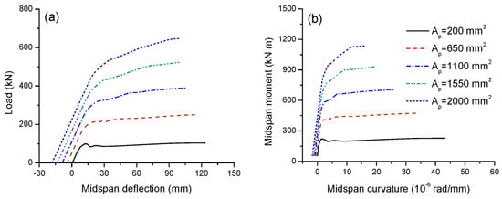 Effect of tendon area on the deformation development. (a) Load-deflection; (b) moment-curvature.