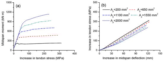 Effect of tendon area on tendon stress development. (a) Moment versus increase in tendon stress; (b) increase in deflection versus increase in tendon stress.
