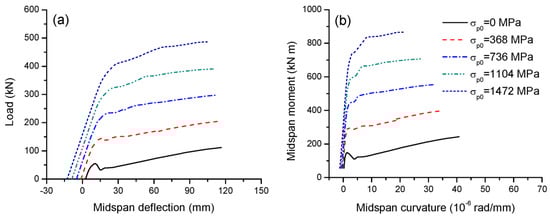 Five initial prestress levels are considered, i.e., 0, 20, 40, 60 and 80% of the rupture strength, or, equivalently, the initial prestress, σp0, corresponds to 0, 368, 736, 1104 and 1472 MPa. Figure 6a,b show the load-deflection and moment-curvature behavior of beams with various prestress levels.