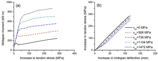 Figure 7a,b illustrate the effect of the initial prestress on the tendon stress versus midspan moment and deflection, respectively. Over the elastic range, the initial prestress has no impact on the increase in tendon stress as the moment develops, as shown in Figure 7a. A higher initial prestress corresponds to a higher increment in tendon stress at cracking but, generally, a lower one at ultimate. In this analysis, increasing the prestress level from 20 to 80% causes a reduction in the ultimate stress increase in external tendons by 10.7%. It is seen in Figure 7b that, when deflecting, the greater the initial prestress, the slower the increase in tendon stress.