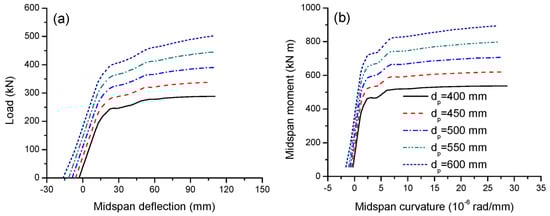 The initial tendon depth (maximum depth), dp, ranging from 400 to 600 mm, is used to investigate its effect on the structural response. The load-deflection and moment-curvature behavior are shown in Figure 8a,b, respectively. From Figure 8, it is seen that a larger tendon depth registers a larger upward deflection prior to load application. In addition, the cracking and ultimate loads or moments substantially increase as the tendon depth increases. In this analysis, increasing the tendon depth from 400 to 600 mm2 causes an increase in the ultimate load by 74.2%. However, the ultimate deflection, curvatures and flexural ductility are insensitive to the tendon depth, as presented in Table 3.