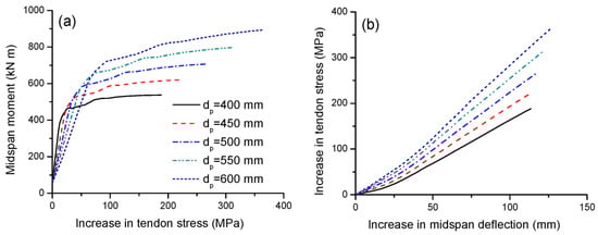 Figure 9a,b illustrate the tendon stress versus midspan moment and deflection for beams with various tendon depths, respectively. As the tendon depth increases, the ultimate tendon stress increases substantially. As mentioned previously, the beams with different tendon depths exhibit approximately the same deformation at ultimate, implying there are approximately the same concrete strain distributions along the depth of the sections of these beams. Therefore, the larger the tendon depth, the larger the average change in the concrete strain at the same level of the external tendons and, thereby, the larger the tendon stress increase. Due to a lower reduction in the effective tendon depth, a larger tendon depth assumes relatively less significant second-order effects, which would reduce relatively less tendon stresses. In this analysis, increasing the tendon depth from 400 to 600 mm causes an increase in the ultimate tendon stress increment by 93.2%. For the same deflection, the greater the tendon depth, the greater the tendon stress increase. The slopes of the stress–deflection relationship for beams with dp = 400, 450, 500, 550 and 600 mm are 1.70, 1.96, 2.45, 2.86 and 3.30 MPa/mm, respectively.