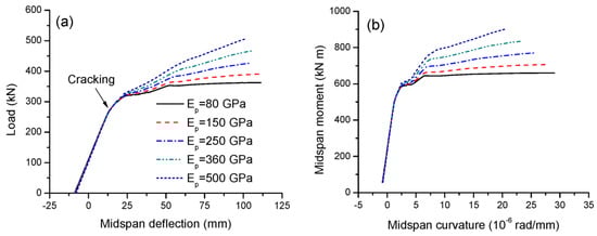The elastic modulus of CFRP tendons, Ep, ranges from 80 to 500 GPa [10]. Figure 10a,b show the effect of the tendon elastic modulus on the load-deflection and moment-curvature behavior, respectively. The beams exhibit identical behavior up to cracking. After that, the behaviors differ because the contribution of the external tendon becomes increasingly important. A higher tendon modulus of elasticity mobilizes stiffer behavior of the beams. As the tendon modulus of elasticity increases, the ultimate load and flexural strength increase, while the ultimate deflection and curvature tend to decrease. As presented in Table 4, increasing the tendon elastic modulus from 80 to 500 GPa leads to a decrease in deflection ductility by 11.1% and in curvature ductility by 31.4%.