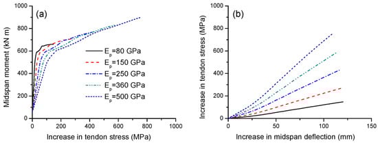 Figure 11a,b show the effect of the tendon elastic modulus on the tendon stress versus midspan moment and deflection, respectively. At a given moment or deflection level, a high tendon elastic modulus corresponds to a significantly higher tendon stress. The ultimate stress increase in external tendons with an elastic modulus of 500 GPa is 5.17 times that of 80 GPa. It should be noted that the stress ratio of 5.17 is smaller than the modulus ratio of 6.25, as a higher tendon elastic modulus would lead to a smaller ultimate tendon strain. The slopes of the stress–deflection relationship for beams with Ep = 80, 150, 250, 360 and 500 GPa are 1.33, 2.45, 3.98, 5.57 and 7.43 MPa/mm, respectively.
