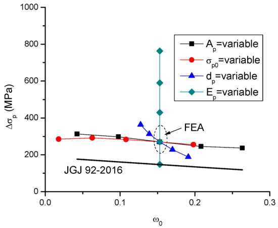 Relationships between Δσp and ω0 according to FEA and JGJ 92-2016.