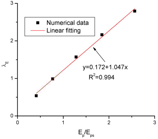 where λE is a coefficient related with the tendon elastic modulus Ep. The FEA data regarding the variation in λE against Ep/Eps is presented in Figure 14, where Eps is the elastic modulus of prestressing steel, taken to be equal to 195 GPa. According to the fit curve, λE is expressed by