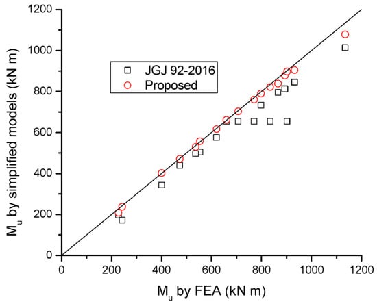 A comparison of Δσp and Mu for beams with different tendon-related variables predicted by the simplified models and FEA is presented in Table 5 and Figure 15 and Figure 16. It is seen that JGJ 92-2016 leads to significant underestimation in Δσp, and, therefore, this code underestimates the flexural strength of the beams. The predicted Δσp is 53.5% of the FEA data, on average, with a standard deviation of 16.2%, while the predicted Mu is 88.6% of the FEA data, on average, with a standard deviation of 6.9%. The proposed simplified model shows much better predictions than JGJ 92-2016. According to the proposed model, the mean discrepancy for Δσp is 0.9%, with a standard deviation of 11.1%, while the mean discrepancy for Mu is −1.6%, with a standard deviation of 2.1%.