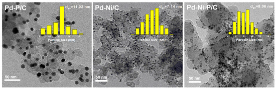 Three types of Pd-based catalysts (Pd-P/C, Pd-Ni/C, and Pd-Ni-P/C) were prepared based on our previous work (see Section 2. Materials and Methods for the details) [24]. Transmission electron microscopy (TEM) indicated the particle sizes of Pd-P, Pd-Ni, and Pd-Ni-P were 11 nm, 7.1 nm, and 8.1 nm, respectively (Figure 1). The commercial Pd/C showed a similar NP size of about 10 nm (Figure S1). Although the average particle sizes were similar between those of Pd-P and Pd-Ni-P, the TEM images showed that there were large particles in the Pd-P samples. As the Pd-P/C and Pd-Ni-P/C catalysts were prepared by annealing under 500 °C, adding Ni could probably stabilize the thermostability of NPs from aggregation. Based on our previous study, the sizes of the Pd-Ni-P NPs increased gradually from 7.0 nm to 8.1 nm when they were calcined from 300 °C to 500 °C [24]. This might imply that the atoms mainly diffused within the particle rather than suffering Ostwald ripening. In comparison, Pd-P might be less thermostable, with parts of the NPs suffering Ostwald ripening to form large ones. The Brunauer–Emmett–Teller (BET) surface areas of Pd-P/C, Pd-Ni/C, and Pd-Ni-P/C were determined as 90 m2/g, 96 m2/g, and 134 m2/g, respectively (Table S1). Pd-Ni-P/C exhibited a larger area than Pd-P/C due to its smaller particle size. On the other hand, the surface area of Pd-Ni/C did not correspond closely to its particle size, probably due to the different synthesis methods used. The four types of Pd-based materials contained similar Pd contents (7.3–10.4 wt.%, Table S2) as determined by inductively coupled plasma-mass spectrometry (ICP-MS). The atomic compositions of Pd-P/C, Pd-Ni/C, and Pd-Ni-P/C were calculated to be Pd72P28/C, Pd36Ni64/C, and Pd34Ni39P27/C, respectively, based on the analysis results of energy dispersive X-ray spectroscopy (EDS) and ICP-MS.