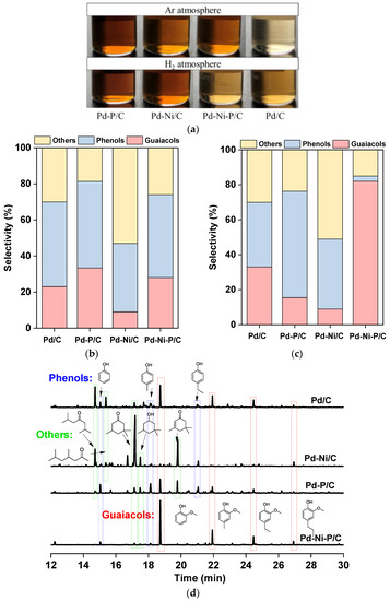 Next, the catalytic depolymerization of lignin was performed under a H2 atmosphere with an initial pressure of 2 MPa. The results are summarized in Figure 3a,c,d and Table 2. When using Pd/C as the catalyst, lignin was converted into liquid products with a yield of 13.2 wt.%. However, a broad product distribution, including guaiacol, phenols, and others, was observed with selectivities of 33%, 37%, and 30%, respectively. In the case of Pd-P/C, the selectivity for phenolic products was the highest, reaching 67%, with a corresponding yield of 9.6 wt.%. The bimetallic Pd-Ni/C catalyst displayed the lowest activity, resulting in a liquid yield of only 10.1 wt.%. Notably, Pd-Ni-P/C demonstrated a significant ability to produce guaiacols. The obtained liquid was the most colorless among those obtained (Figure 3a). Pd-Ni-P/C achieved a yield of 10.1 wt.%, with a remarkable selectivity of 82% for guaiacols.