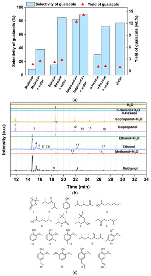 Product distribution of lignin depolymerization over Pd-Ni-P/C catalyst. (a) Yield and selectivity of guaiacols in different solvents (20 mL each) in the absence/presence of water (1 mL). (b,c) GC-MS analysis and list of main products of lignin depolymerization.