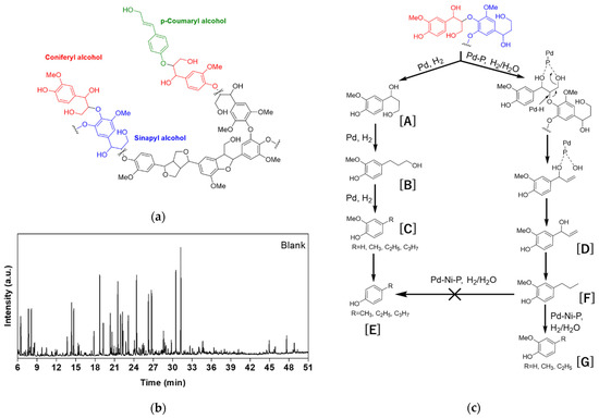 As one major challenge in the direct transformation of lignin stems from its structural complexity, a comprehensive understanding of the molecule structure is crucial for achieving high-value-added products. Typically, lignin is primarily composed of phenylpropyl groups and exhibits three main aromatic structures: syringyl (S), guaiacyl (G), and hydroxyphenyl (H) units [30]. As shown in Figure 5a, each unit is derived from one monophenolic alcohol: sinapyl alcohol, coniferyl alcohol, or p-coumaryl alcohol, respectively. During the depolymerization process, the low-energy C-O bonds (e.g., β-O-4) are first cleaved, leading to the formation of lignin fragments. These fragments can undergo various depolymerization pathways under different catalytic conditions. In Figure 5b, a catalyst-free blank experiment was performed under the standard conditions. It can be seen that the depolymerization products were broadly dispersed, indicating the catalyst is essential for high selectivity of the target products.
