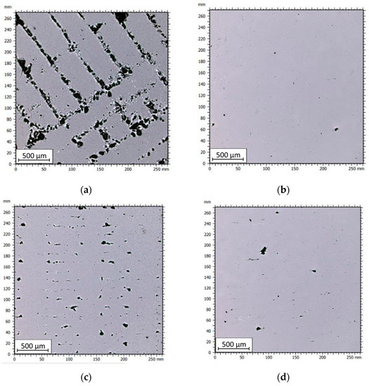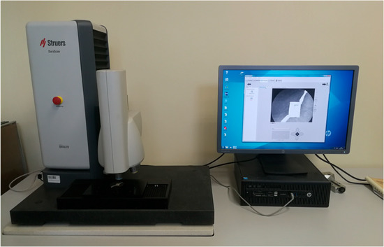 Subsequently, to verify the accuracy of the measurement results obtained using the Archimedes method, the porosity in individual sample sections was measured using dedicated software (Mountains Map, version 7.0). The porosity was calculated based on the average number of grains for each sample. Then, microhardness measurements were performed using the Vickers method according to the PN-EN ISO 6507-1 standard [32], using a Struers DuraScan 70 microhardness tester (Ballerup, Denmark) (Figure 6).